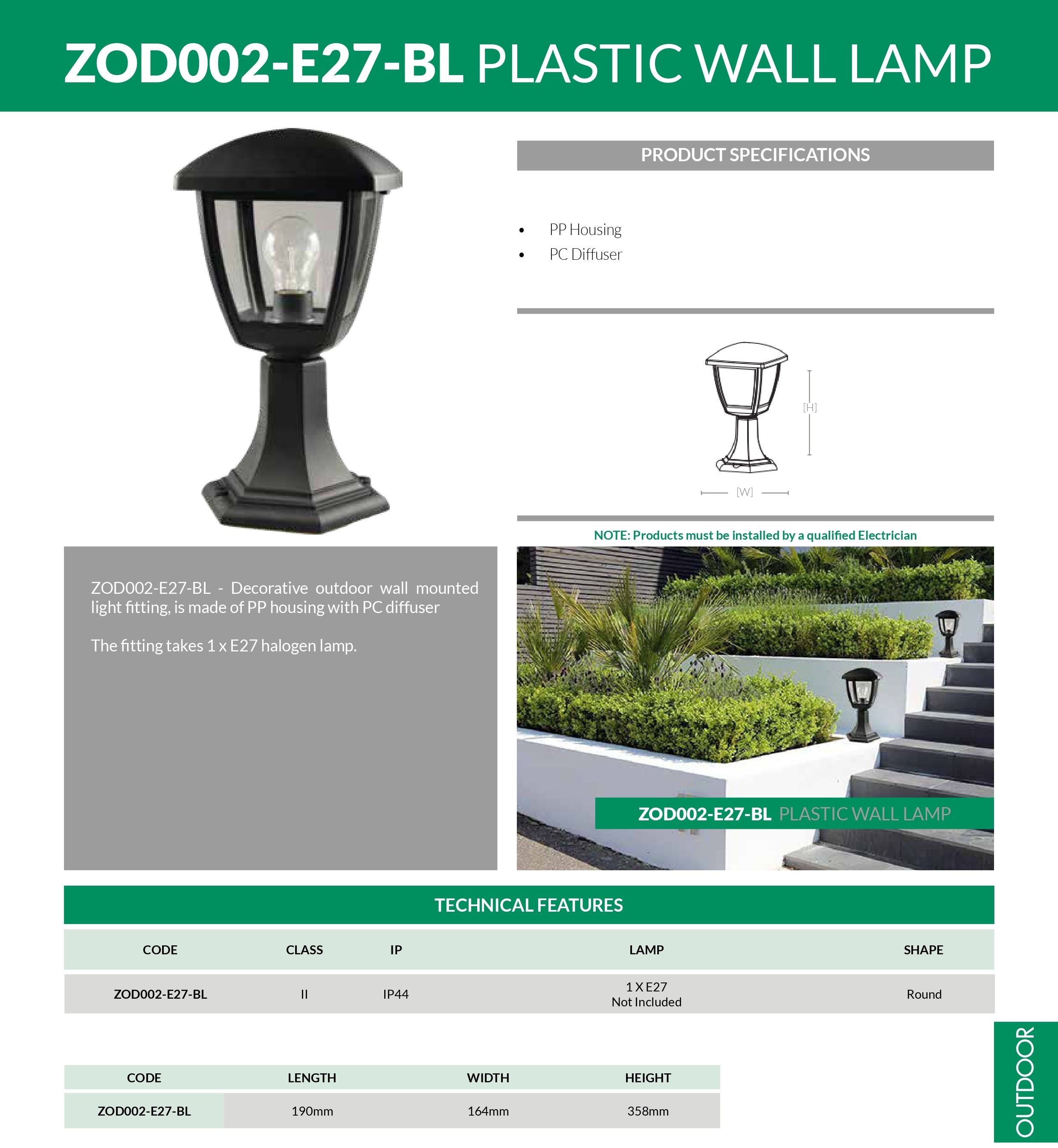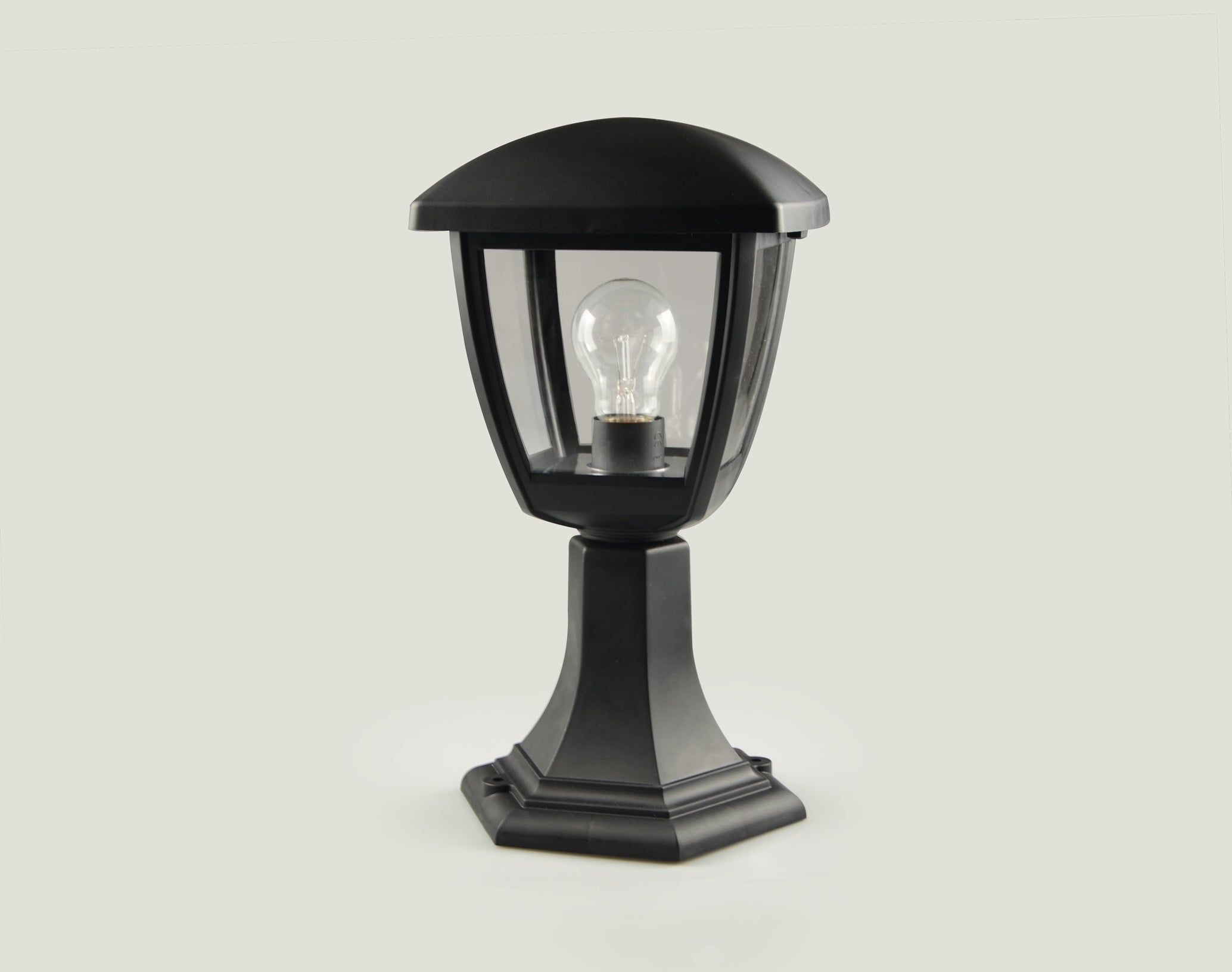 Description The ZOD002E27BL is a rust-resistant, coastal-grade outdoor pedestal lantern designed for long-term durability. The UV-treated PP body ensures high resistance to harsh weather, while the PC diffuser provides crystal-clear illumination. Compatible with E27 lamps (lamp excluded). Ideal for elegant and reliable outdoor lighting applications.